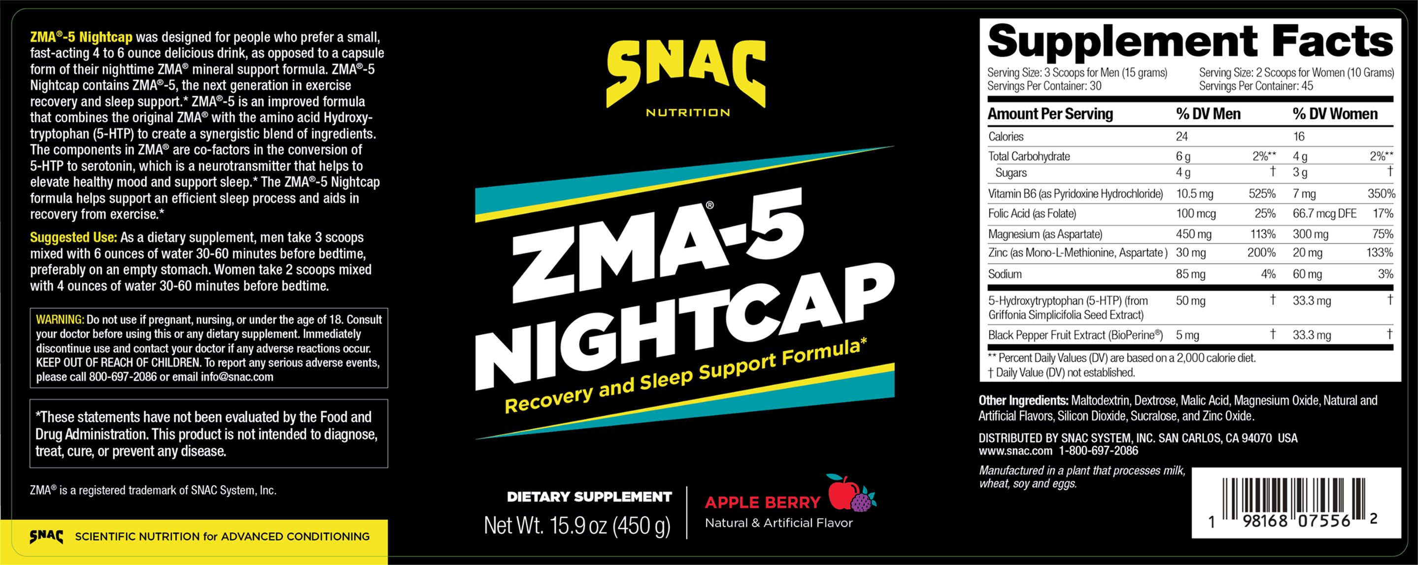OtherMaltodextrin, Dextrose, Malic Acid, Magnesium Oxide, Natural and Artificial Flavors, Silicon Dioxide, Sucralose, and Zinc Oxide.Manufactured in a plant that processes milk, wheat, soy, and eggs. ZMA™ is a registered trademark of SNAC System, Inc. |